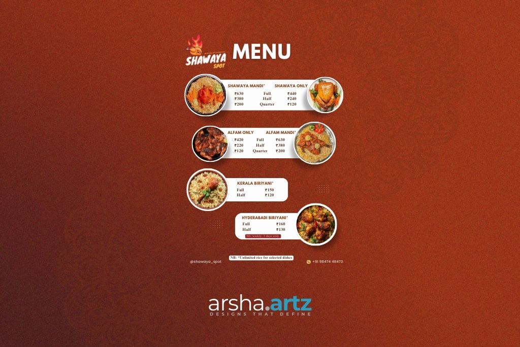 At Shawaya Spot, I designed Professional Menus, digital Posters, and marketing assets while working closely with Client to deliver visually consistent and user-friendly experiences across digital platforms.
