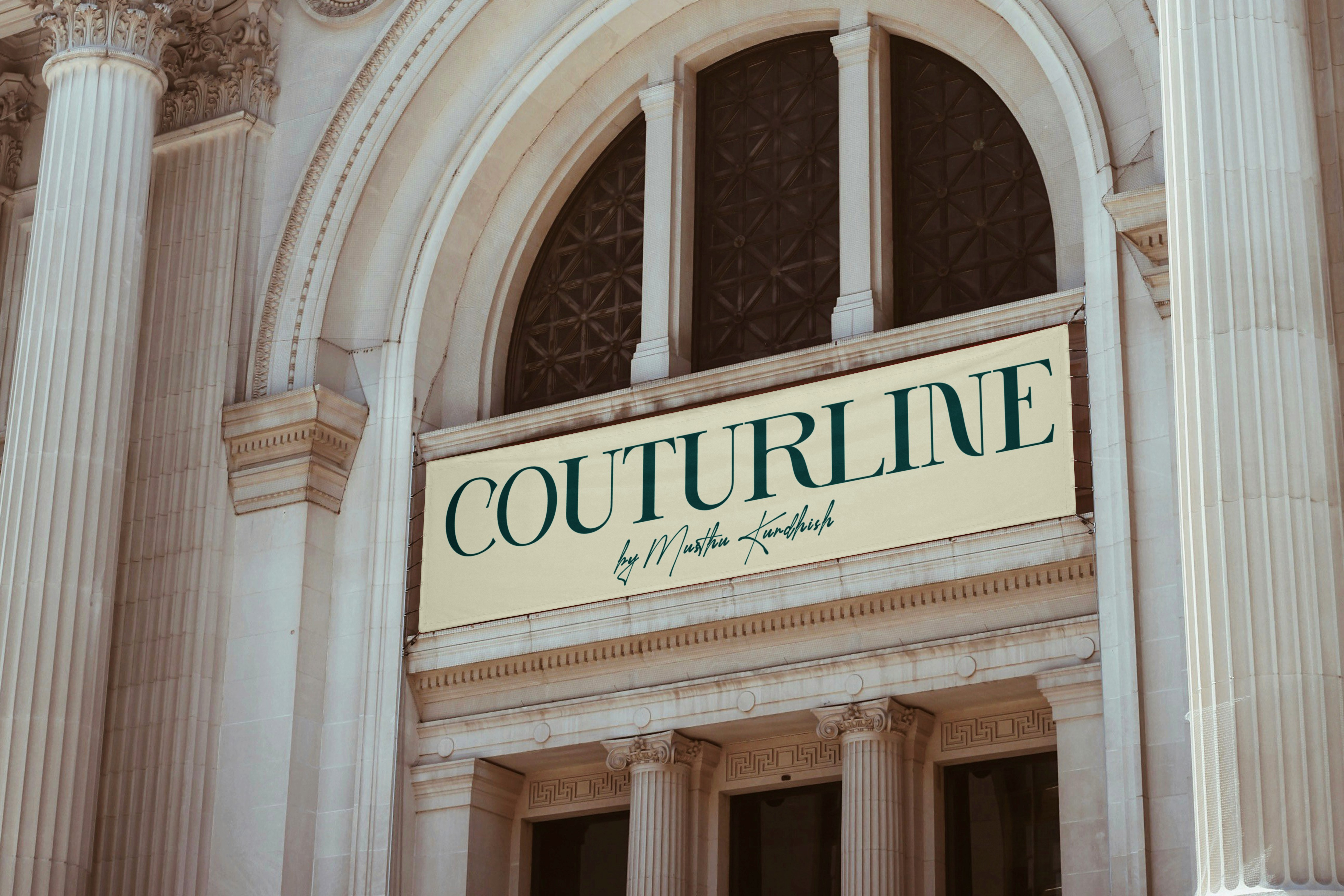 A clean and elegant signage logo design for "COUTURLINE", crafted to complement the building’s classic architecture. The bold serif logo paired with a handwritten signature "by Musthu Kurdhish" creates a refined, high-fashion identity.