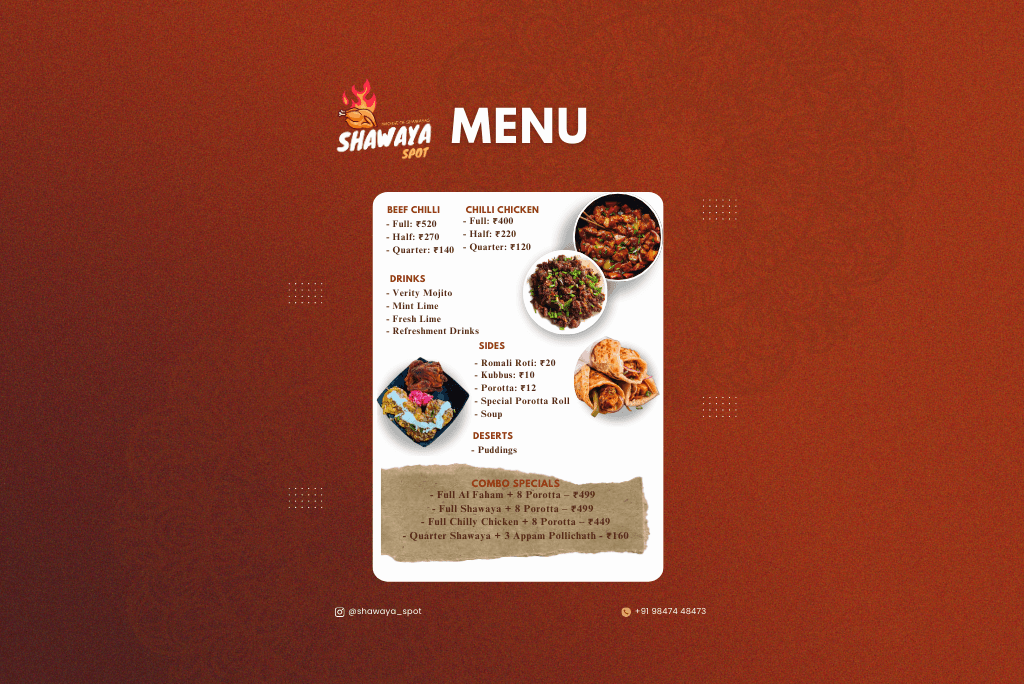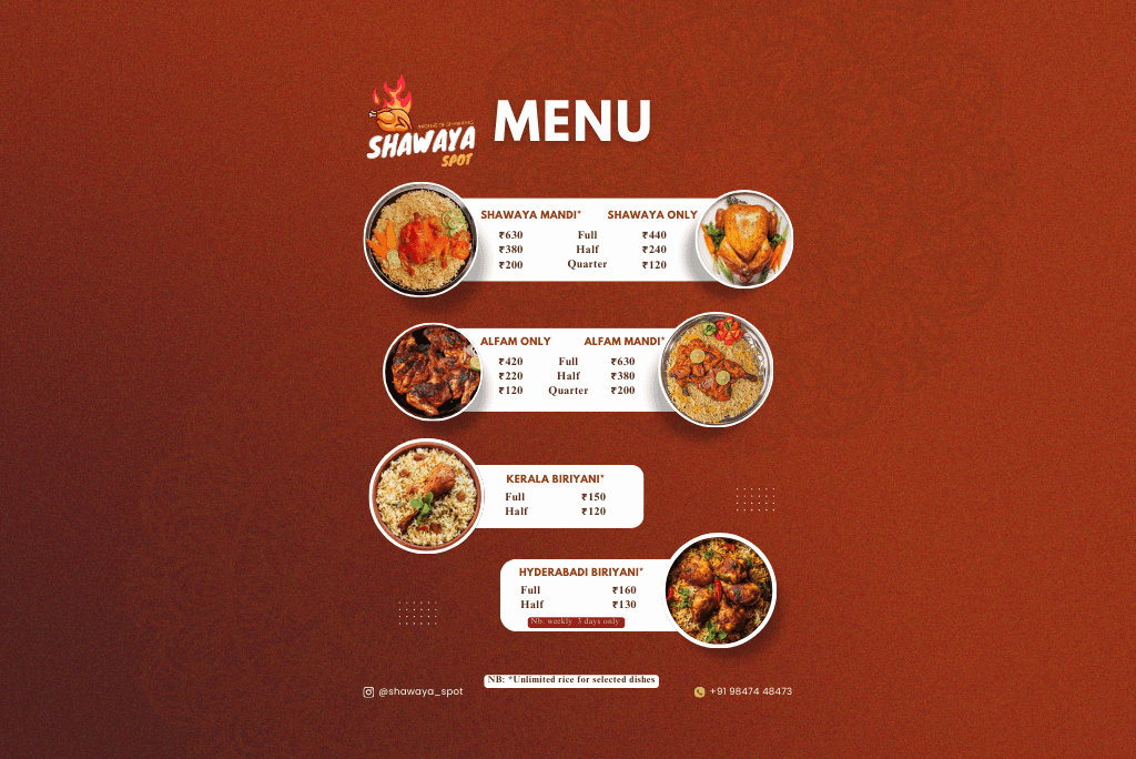 This Shawaya Spot menu features a clean, warm-toned design with bold titles, clear pricing, and appetizing food visuals. The layout is well-organized for easy reading, with key highlights and contact info neatly placed at the bottom. Simple, effective, and eye-catching.