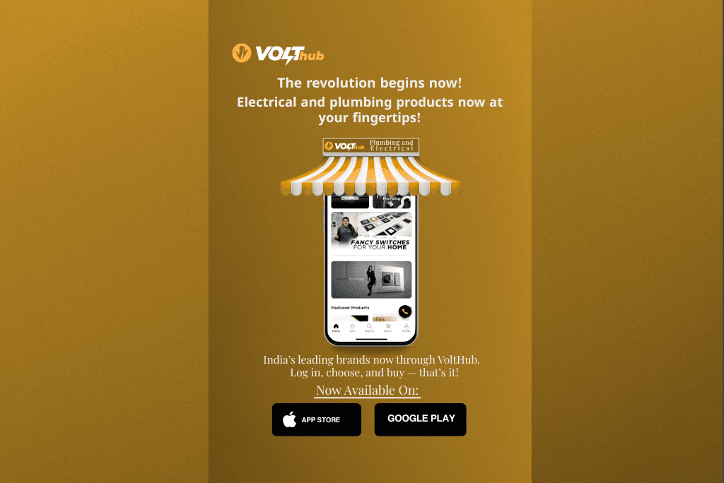 This design promotes VoltHub’s app, highlighting easy access to electrical and plumbing products with a clear call-to-action for downloads on both App Store and Google Play. The visuals emphasize convenience and trusted brands.